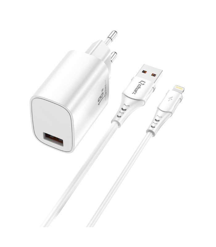 Kit cargador 18W de carga rápida con cable Tipo USB a Lightning con carcasa ignífuga y chip de carga inteligente.